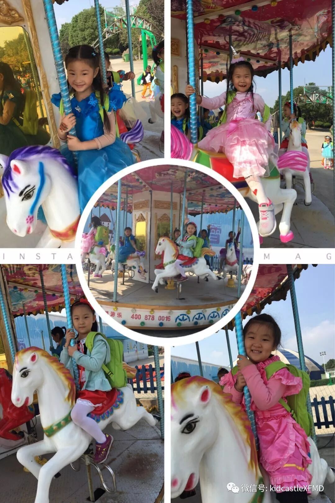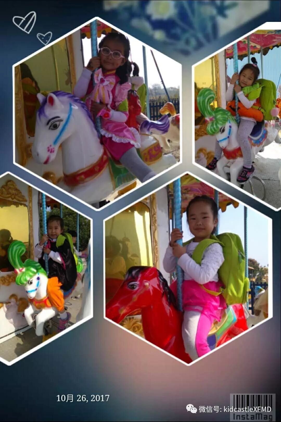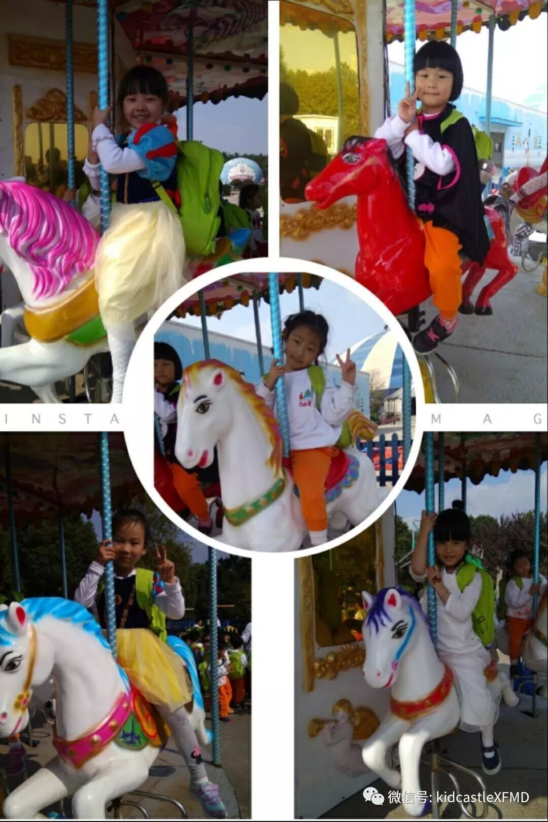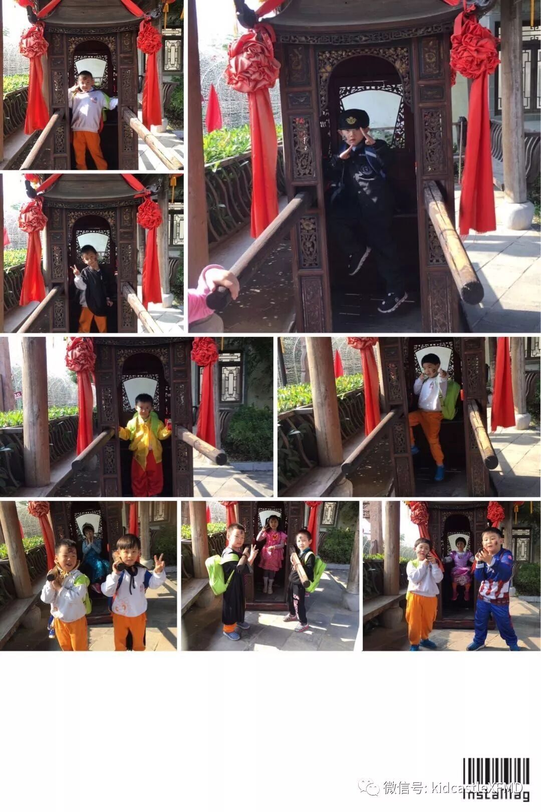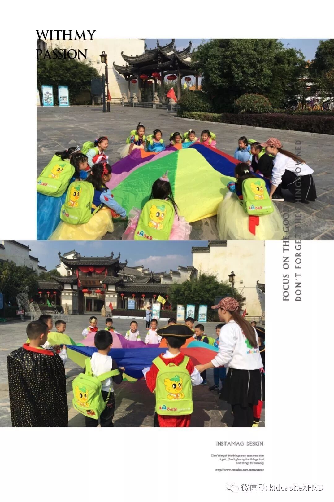 在这如歌如画的季节里你拉着我,我拉着你,漫步在非遗园里感受那份徽派建筑的厚重与那份诗意的宁静里。或者停下来体验一下挖土机、旋转木马、抬花轿等等,又或者在树丛里捡捡松果,在草坪上做做游戏。