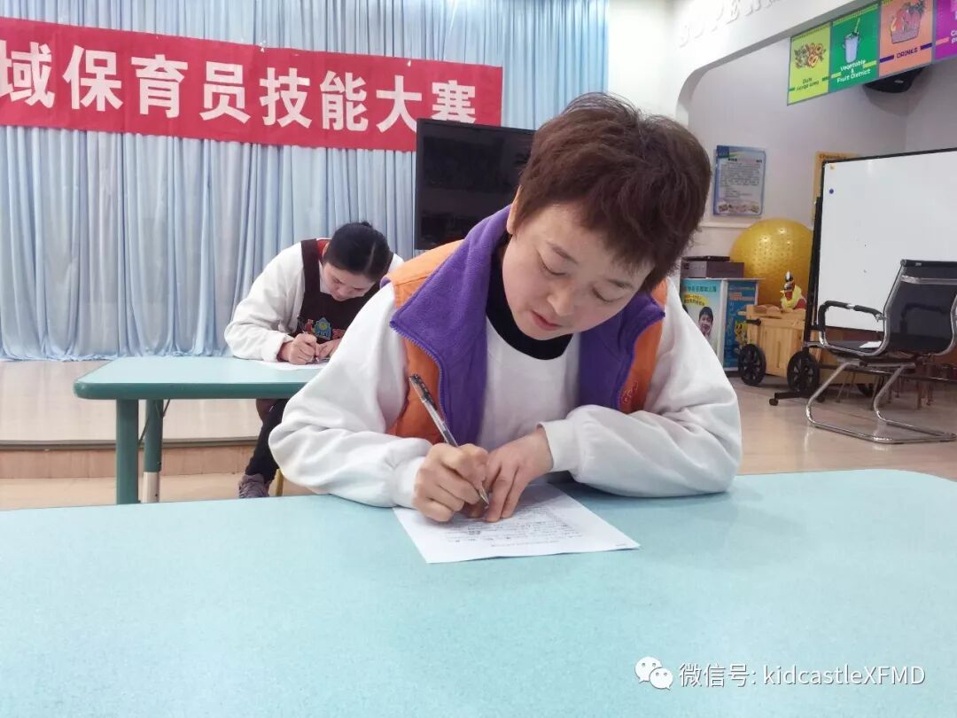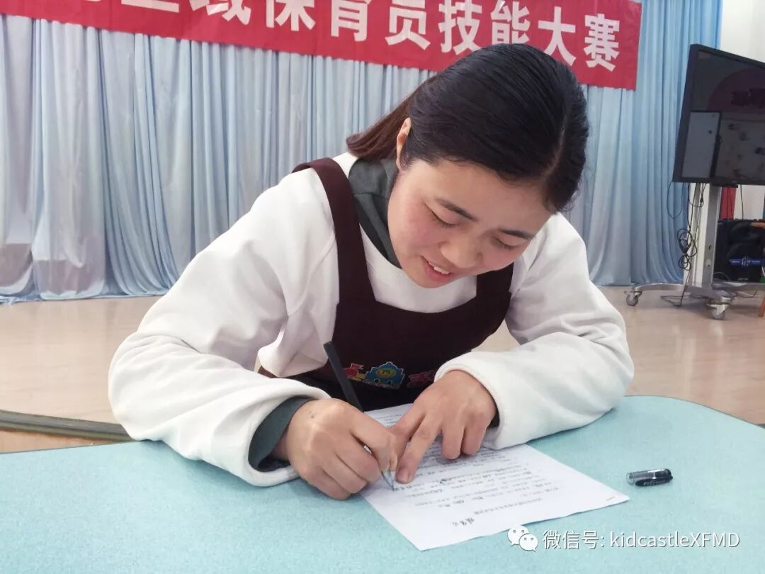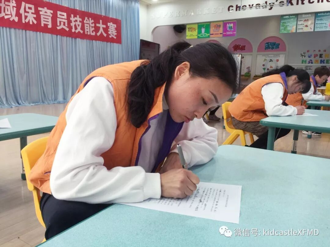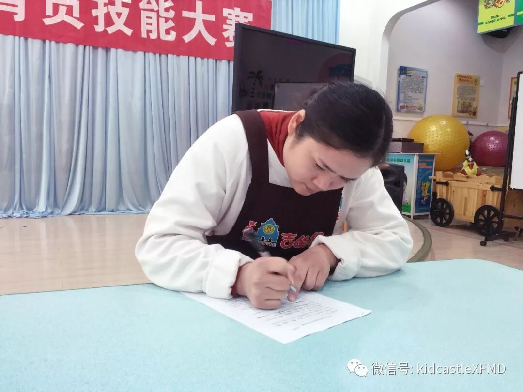 本次比赛包括理论笔试与实践技能操作两个部分的内容,保育员需要进行理论知识答题与常规工作操作演示。大赛的第一项就是理论知识答题,题目涉及生活护理、卫生消毒、疾病预防、安全知识等多个方面。每位老师都准备充分,认真答题。