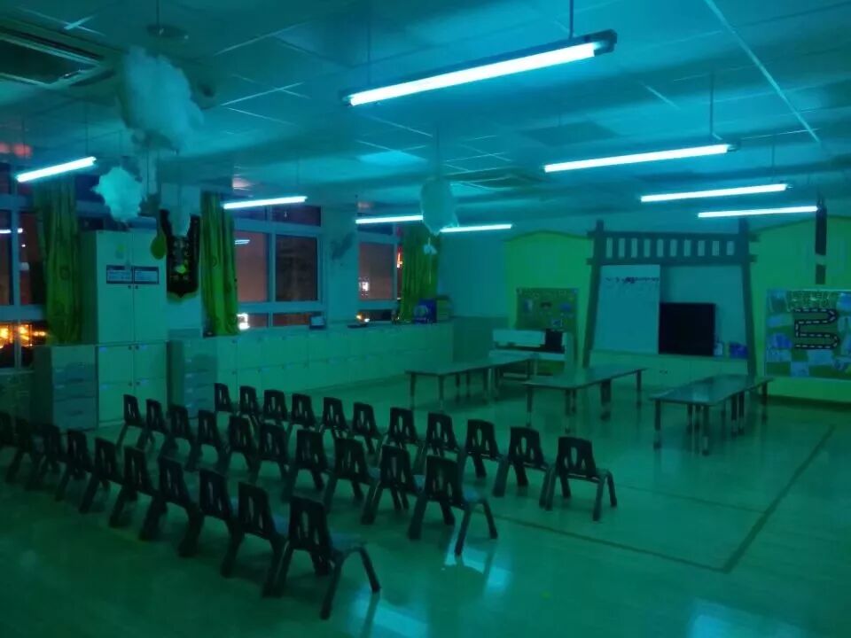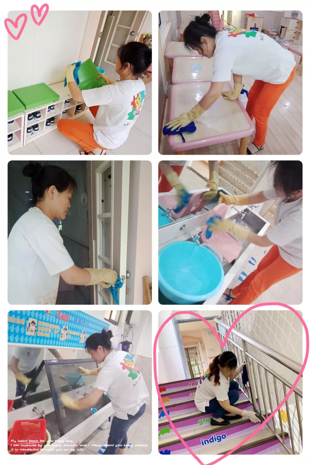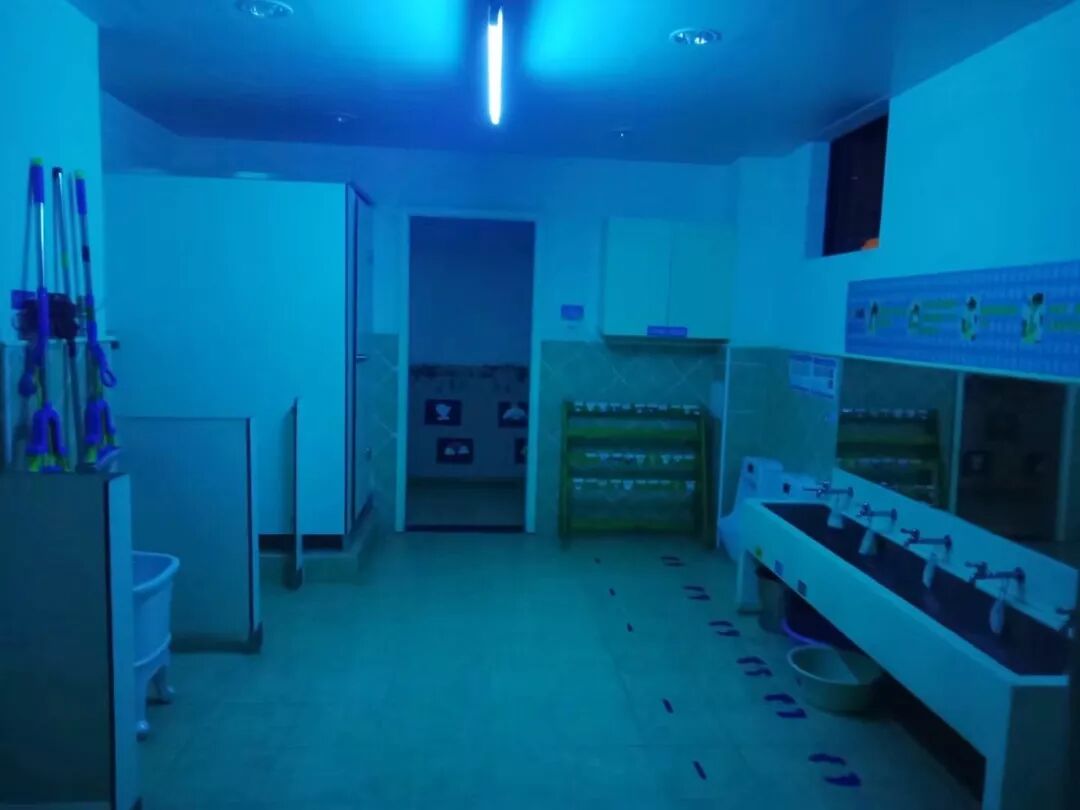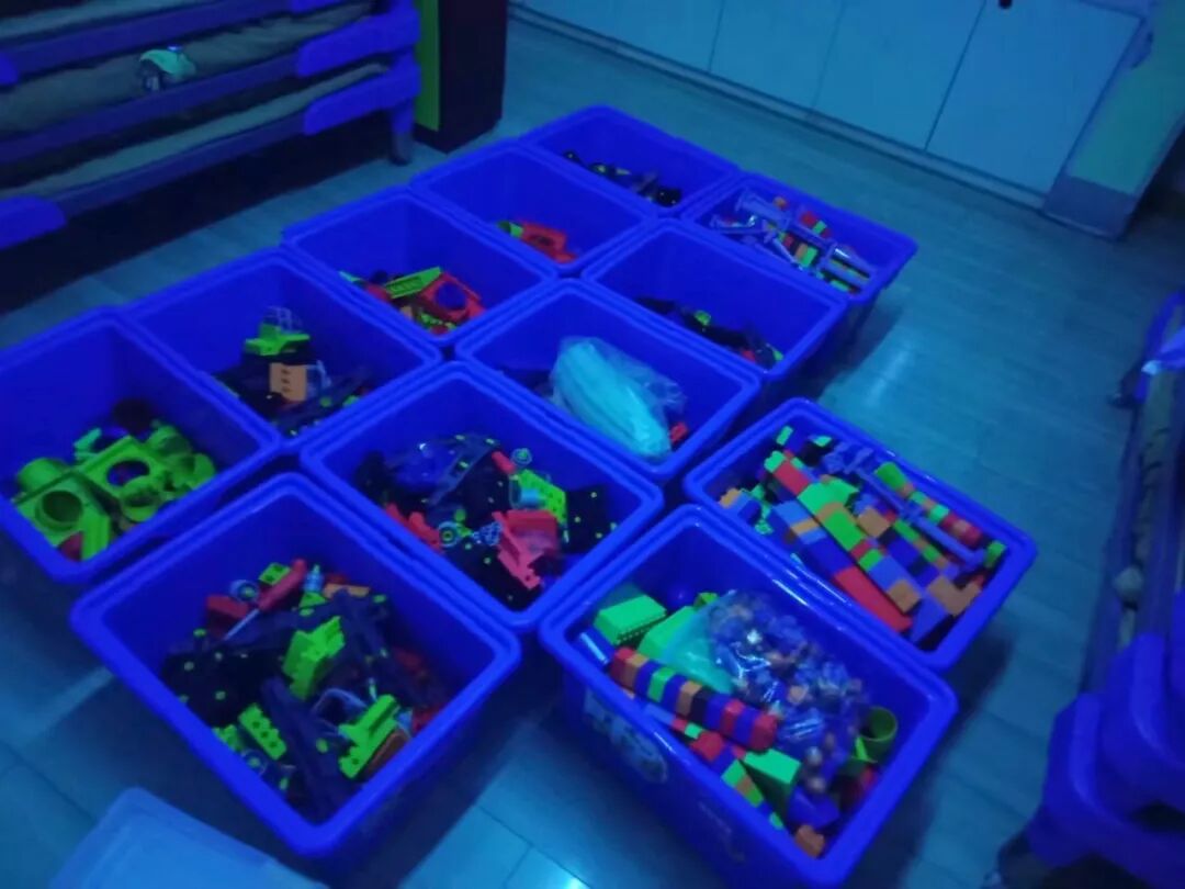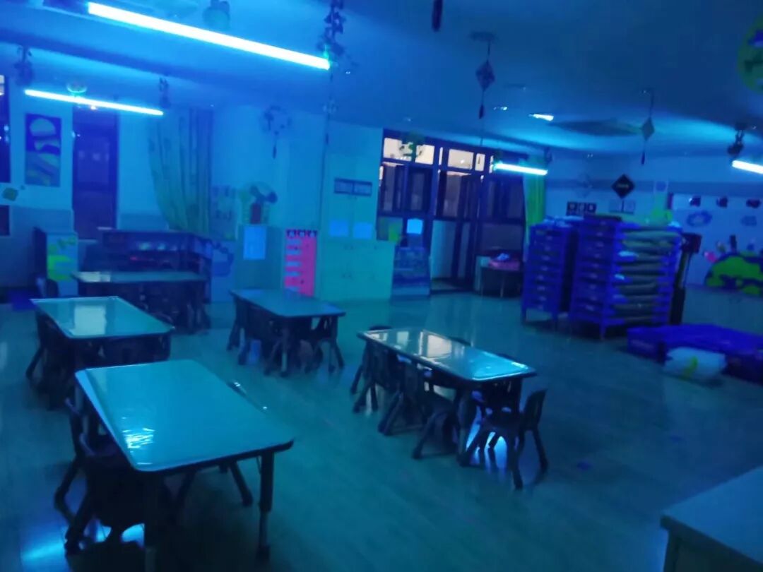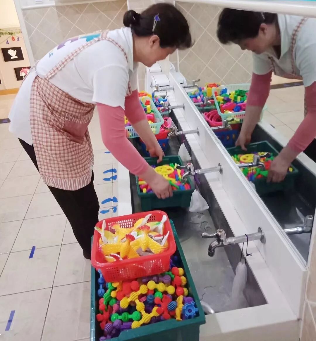 每日用紫外线灯对教室、玩具、图书等进行照射消毒,每次持续照射时间至少1小时。每周五将玩具用药水消毒液浸泡消毒,图书曝晒。