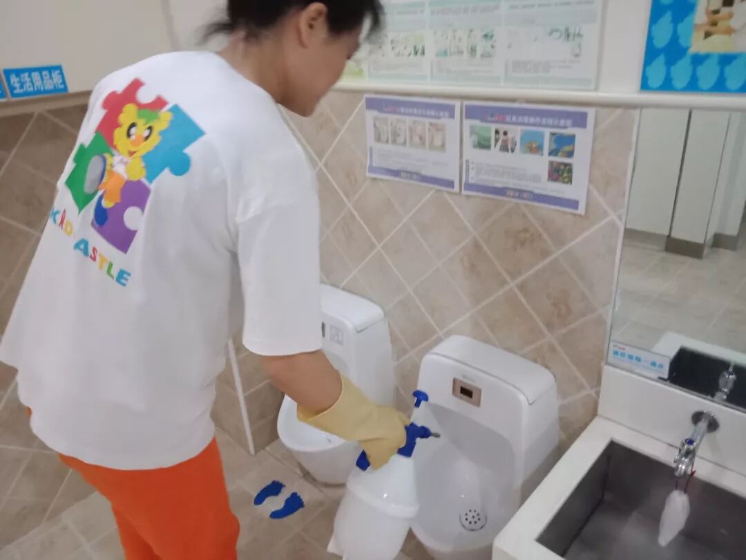 每日幼儿进园前、离园后,用消毒药水液喷洒室内外地面、1米2以下墙体、门把手、水龙头、卫生间、桌椅、儿童床、玩具等幼儿经常触摸的部位,进行消毒处理。