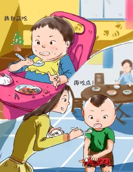 有远见的父母,都带点绝情。让孩子自己吃饭,孩子不想吃也不要强喂,过了饭点就没有饭,孩子挨几次饿,就会懂得按时吃饭。