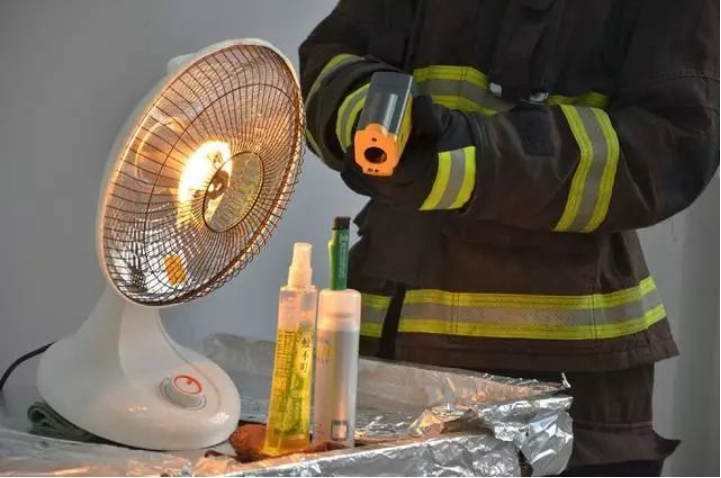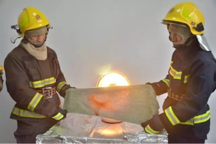 我们来看看消防员的实验:消防员把一条干毛巾覆盖在小太阳正前方,2分钟后,毛巾就被烤焦了。