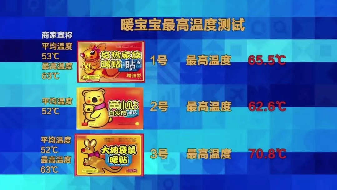 央视之前对暖宝宝做的测评,发现最高温度已经达到可能低温烫伤的程度,最高的甚至超过了安全范围,有70℃!