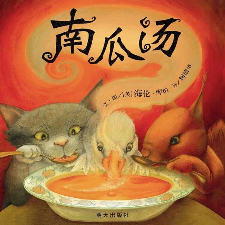 这三个好朋友每天一起做南瓜汤,其中猫负责切南瓜,鸭子负责加盐,松鼠负责搅汤,他们合作做出的南瓜汤是世界上最好喝的。