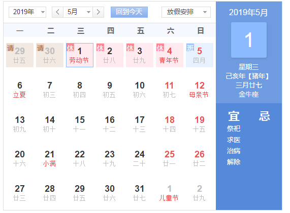 4月28日(星期日)、5月5日(星期日)正常上课,5月1日(星期三)到4日(星期六)共放假4天,2019年5月5日正常上课,请各位家长提前做好出行安排!