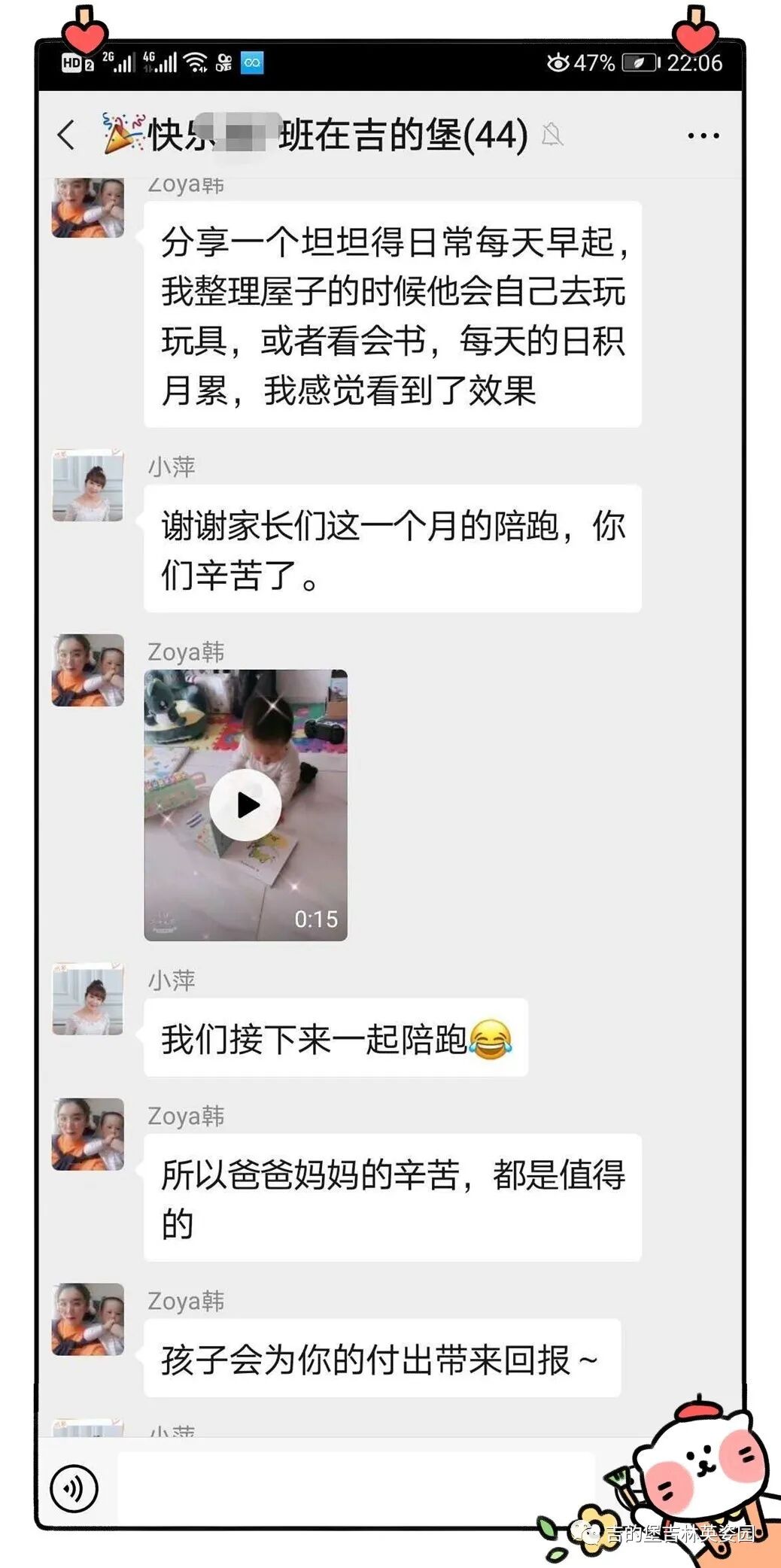 宝贝们在爸爸妈妈和老师的督促鼓励下每天都能够按照老师的要求完成任务养成良好的习惯。老师看着班级群里按时回传的视频、照片也为宝贝们感到骄傲!月末的总结为孩子们颁发了线上奖状!老师和家长的鼓励是孩子坚持进步最大的动力。