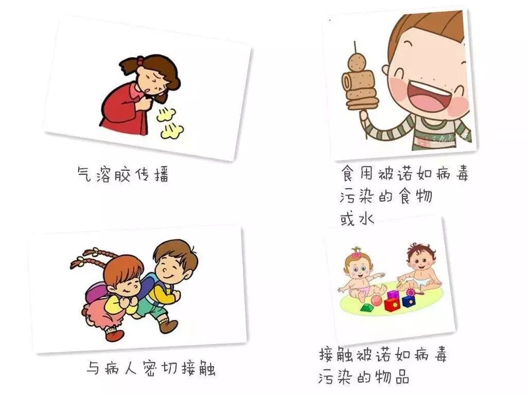 诺如病毒可通过食物、水、病人呕吐的气溶胶等传播。以肠道传播为主,可通过污染的水源、食物、物品、空气等传播,潜伏期多为12~48小时,一般2~3天可自行恢复。