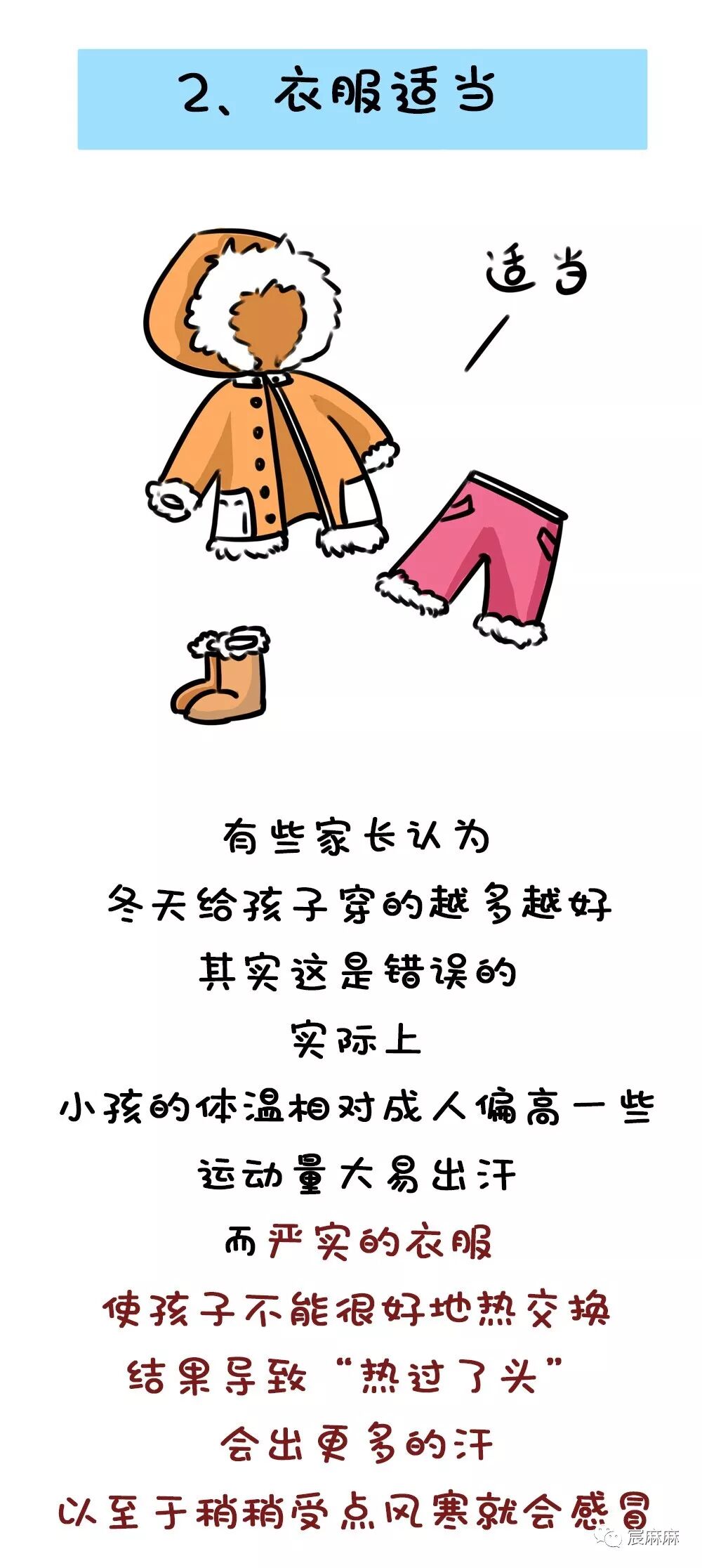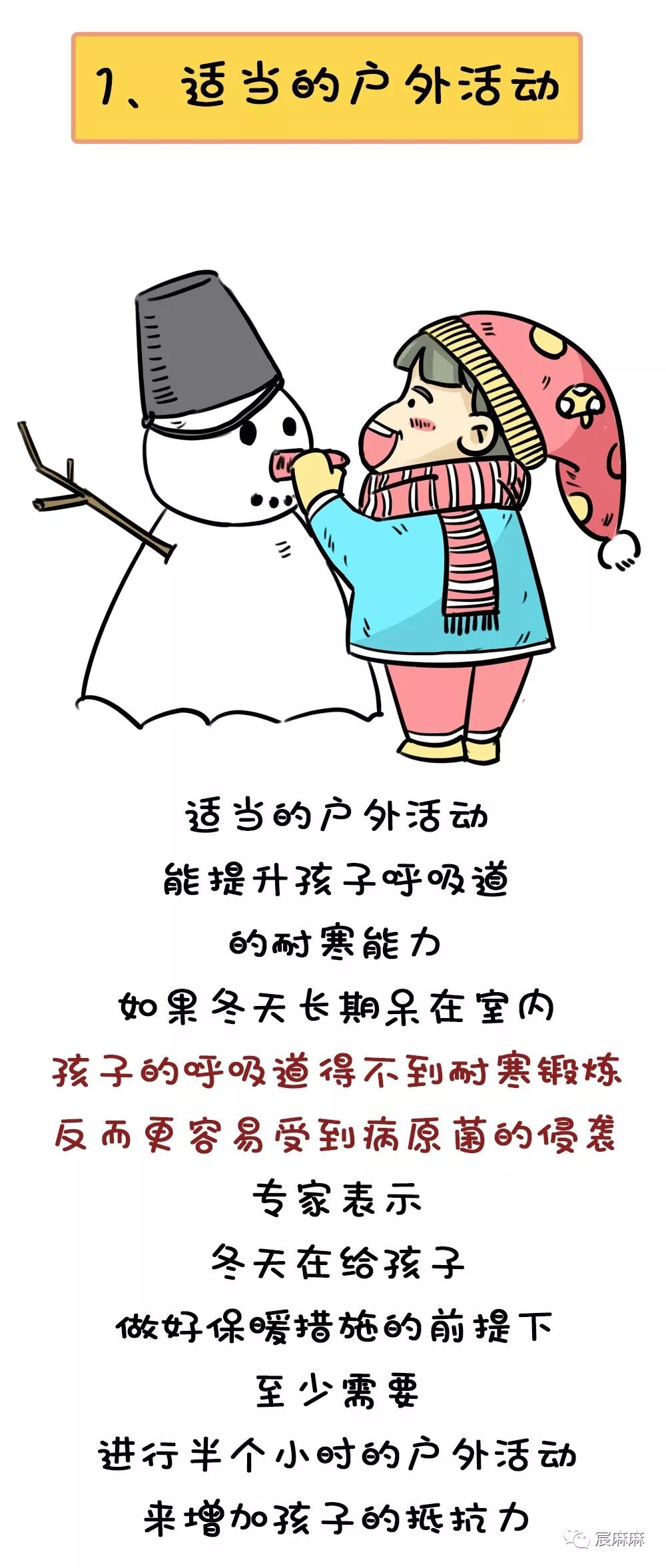 冬季到了,天气寒冷,家长要使孩子在冬季安然无恙,应让孩子合理穿衣,适应寒冷环境,增强机体抗病力及减少感染机会。应注意夜间给宝宝盖好被褥,家长应勤查看,幼儿蹬被时及时盖好,以免孩子着凉。冬天也要坚持勤洗澡,并且应在清洁工作后,注意为宝宝婴儿润肤露,以保持皮肤滋润。