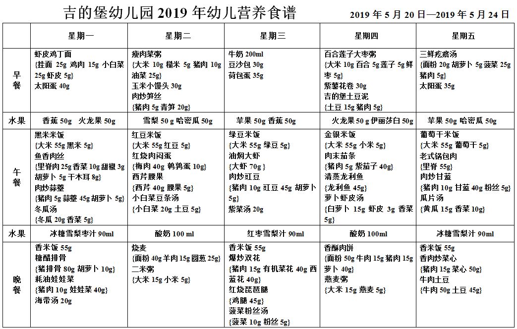 吉的堡幼儿园2019年5月20日==2019年5月24日幼儿食谱及温馨提示