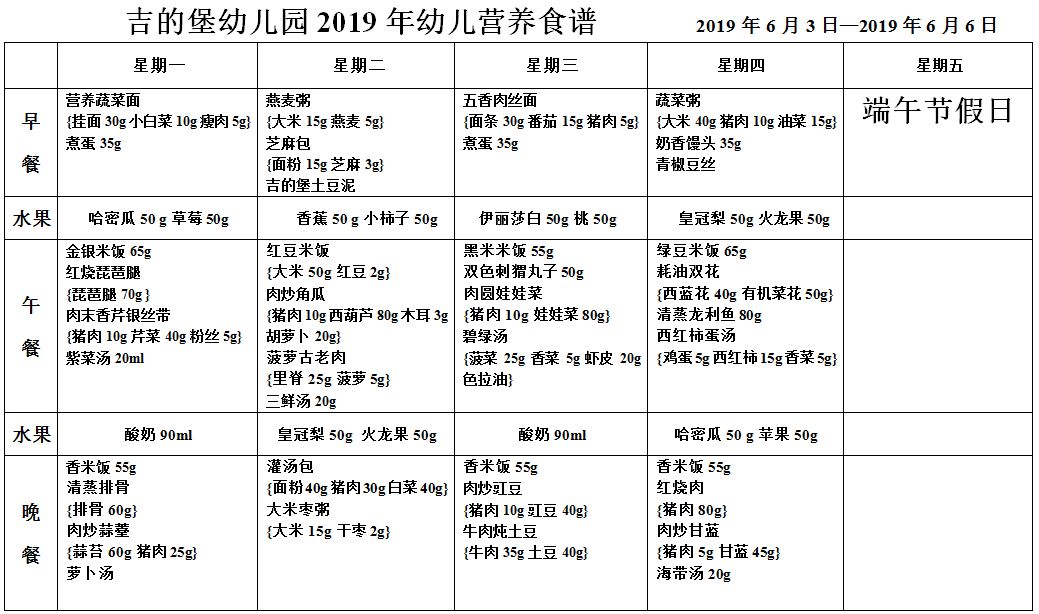 吉的堡幼儿园2019年6月3日--2019年6月6日幼儿食谱及温馨提示