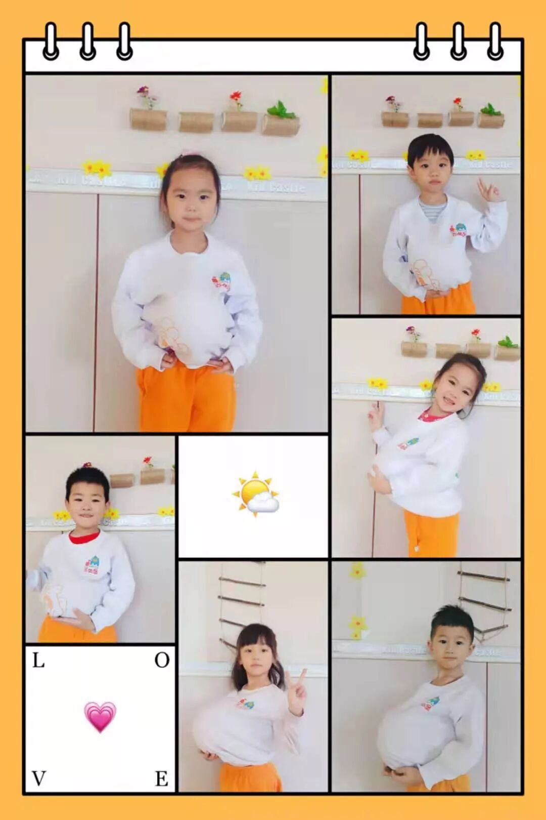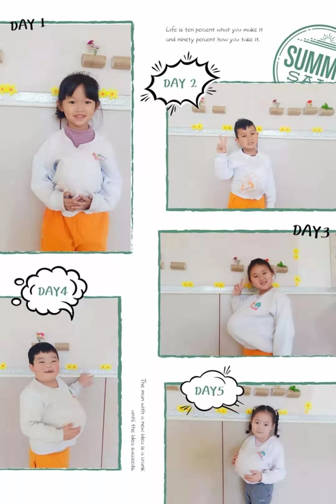 中大班的宝贝儿开启的是“孕妈妈模式”。一个个的“大肚子”在校园里晃悠着,失去了往日的灵敏,孩子们从小小的不方便中体会着妈妈的艰辛。