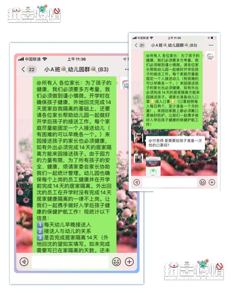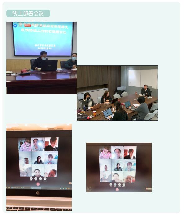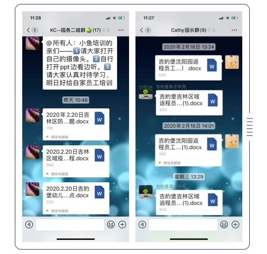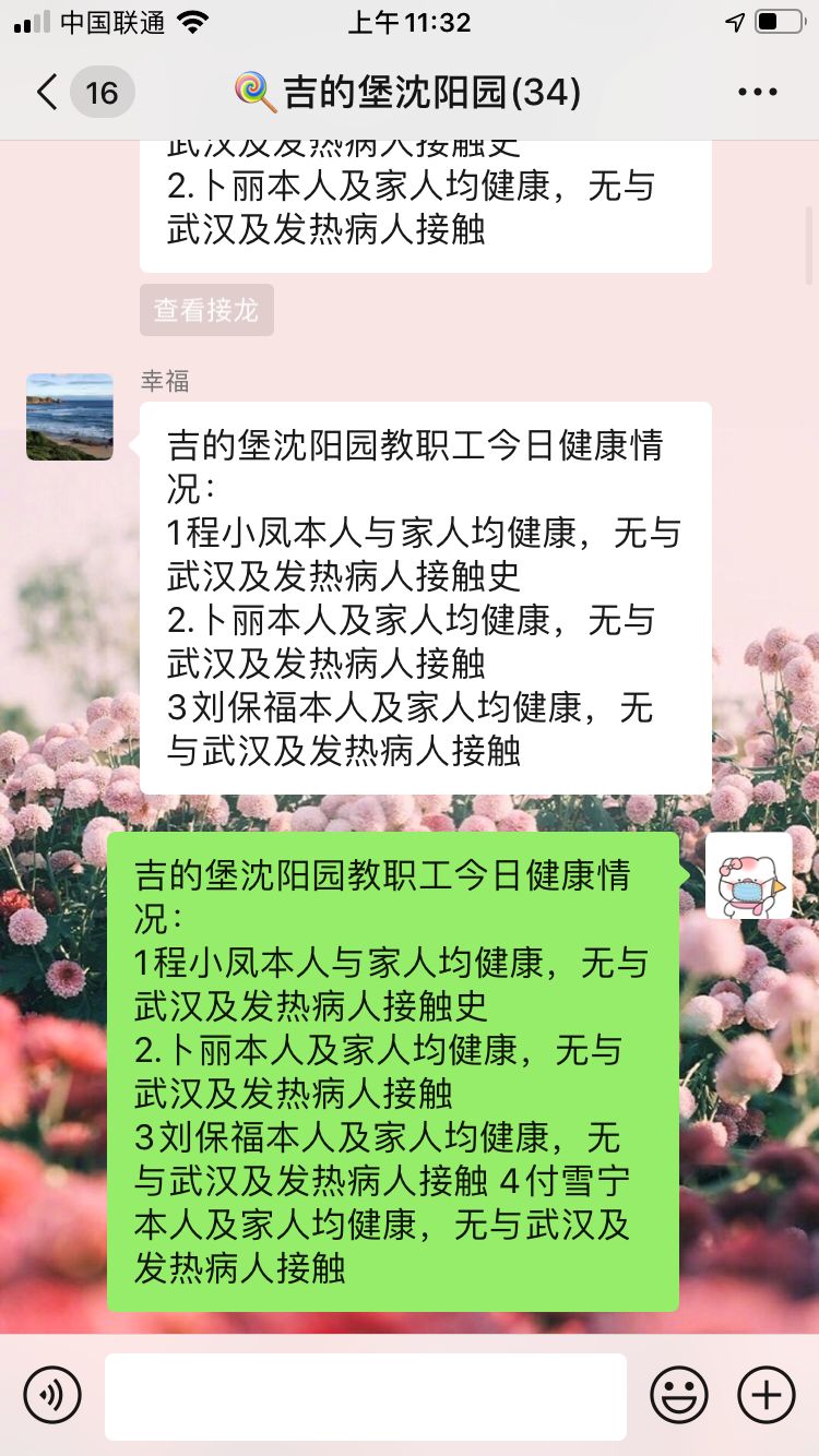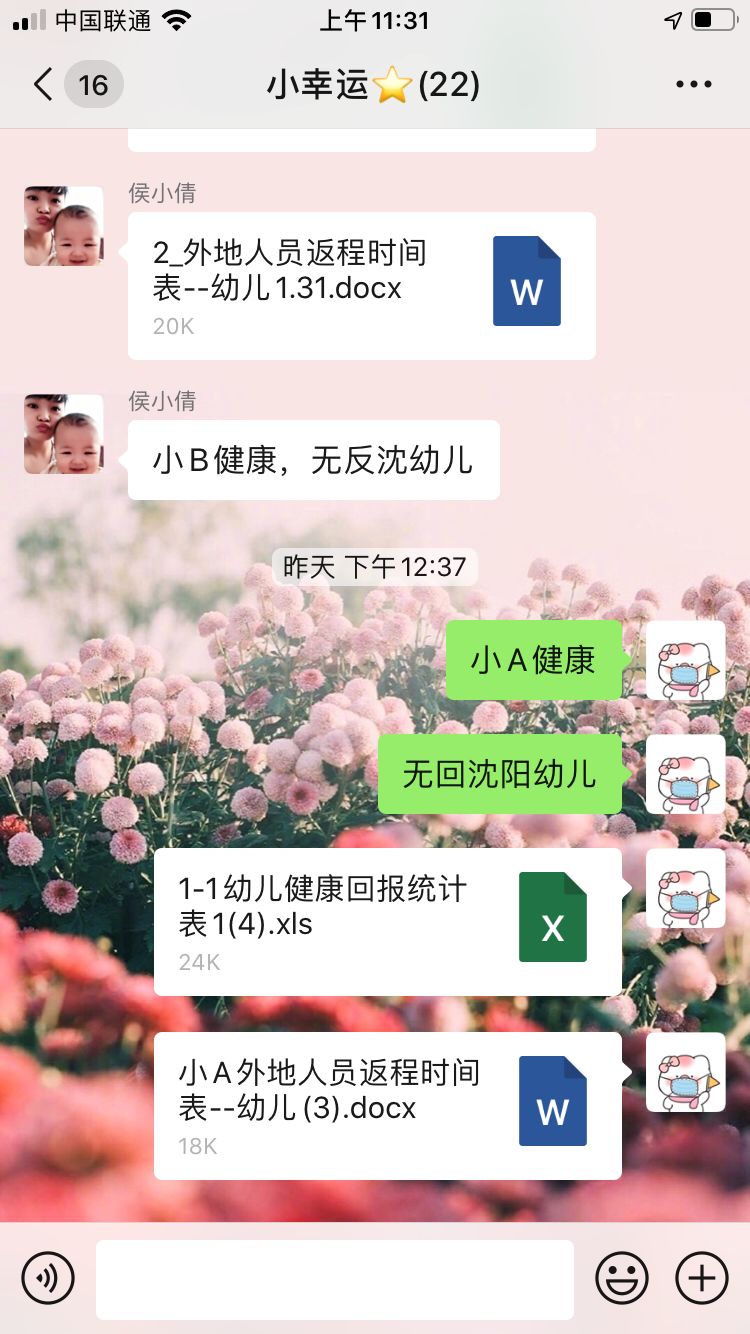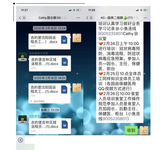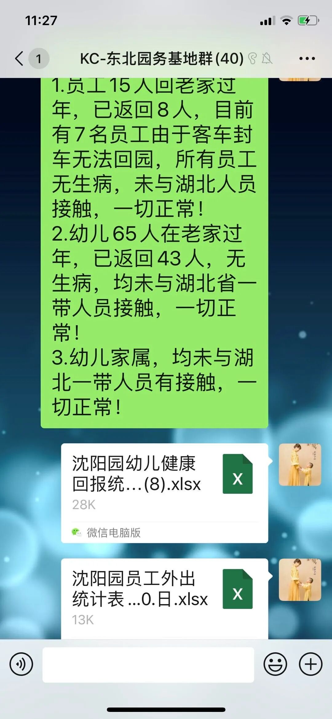 随后组织各线上小组开展工作,要求全园教职工自查健康状况以及湖北武汉相关史,并上报当前所处位置,并且在微信会议中表示,全园教职员工务必取消所有外出计划,无特殊情况尽量宅家,在外员工原地待命;确保疫情防控各项工作科学,规范,有效的开展。